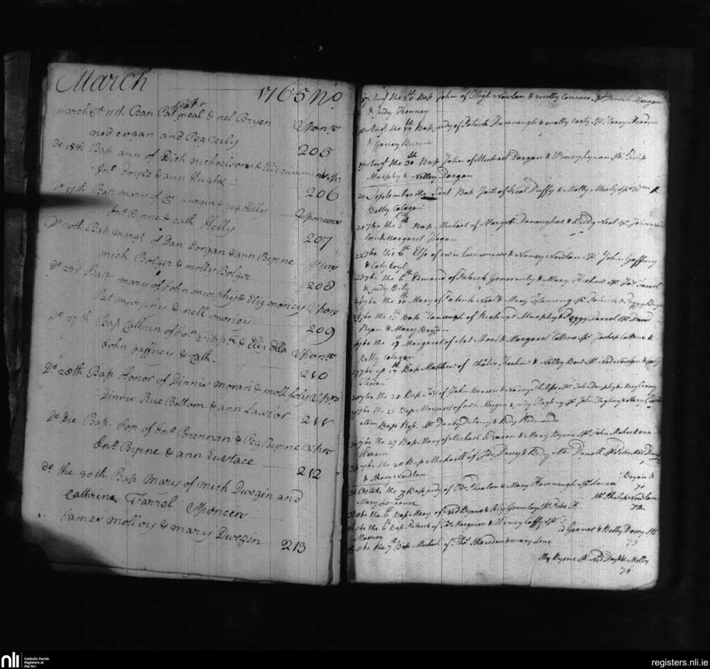 Tullow; County of Carlow; Diocese of Kildare and Leighlin. Baptisms, Mar. 1765 to Oct. 1765