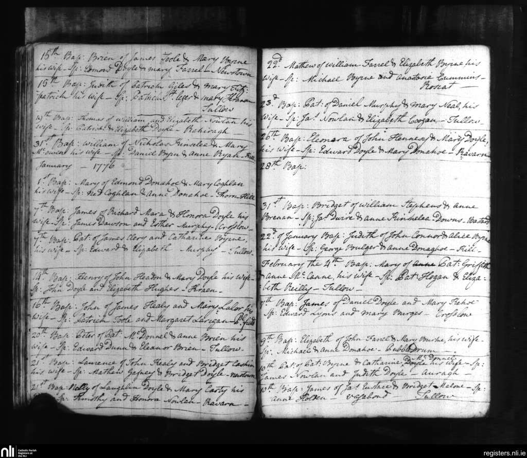 Tullow; County of Carlow; Diocese of Kildare and Leighlin. Baptisms, Dec. 1775 to Feb. 1776