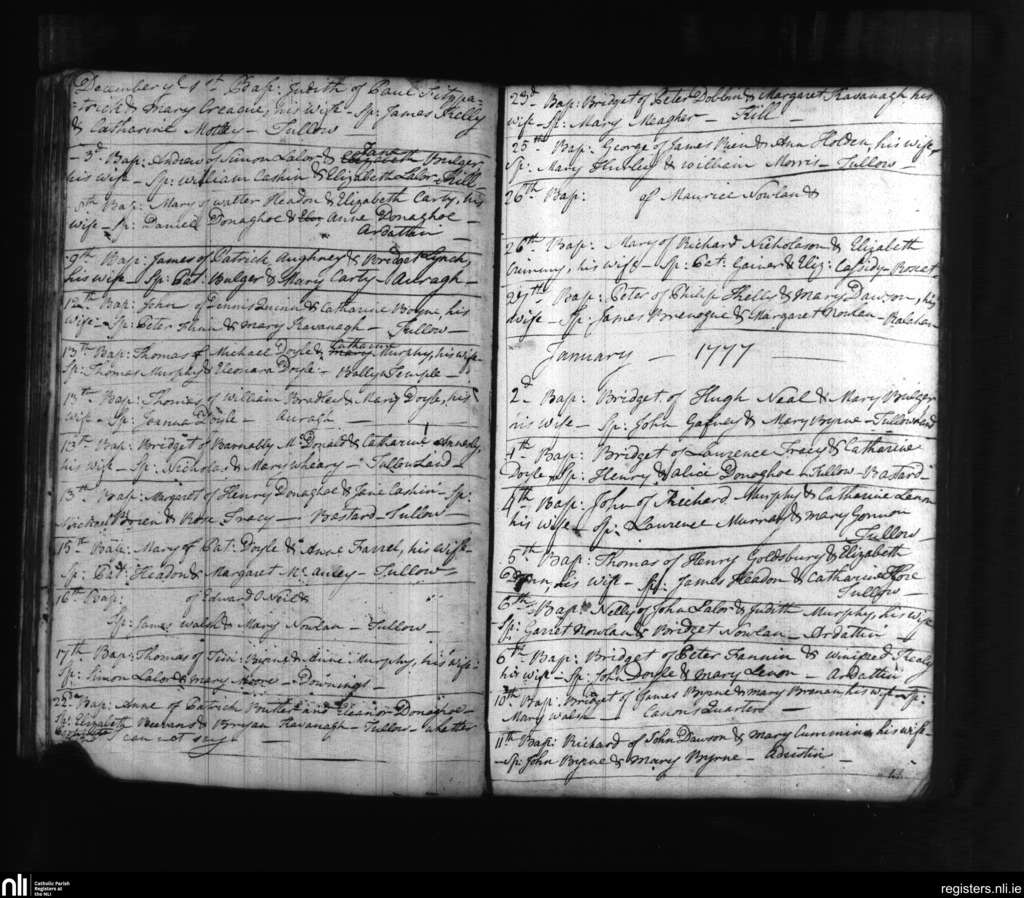 Tullow; County of Carlow; Diocese of Kildare and Leighlin. Baptisms, Dec. 1776 to Jan. 1777