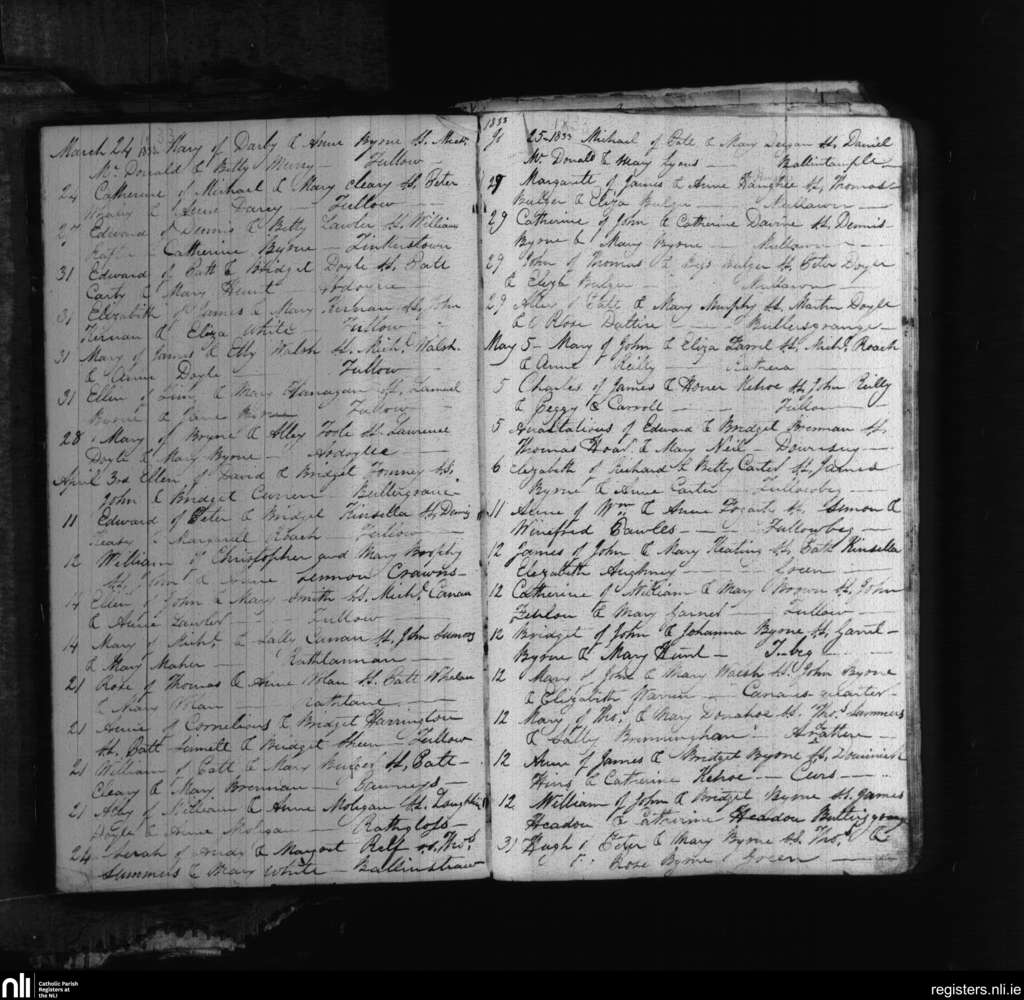 Tullow; County of Carlow; Diocese of Kildare and Leighlin. Baptisms, Mar. 1833 to May 1833