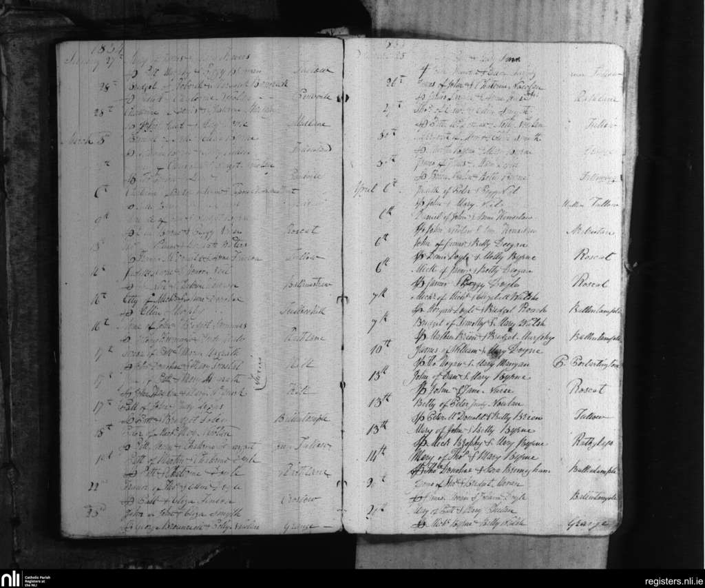 Tullow; County of Carlow; Diocese of Kildare and Leighlin. Baptisms, Feb. 1834 to Apr. 1834