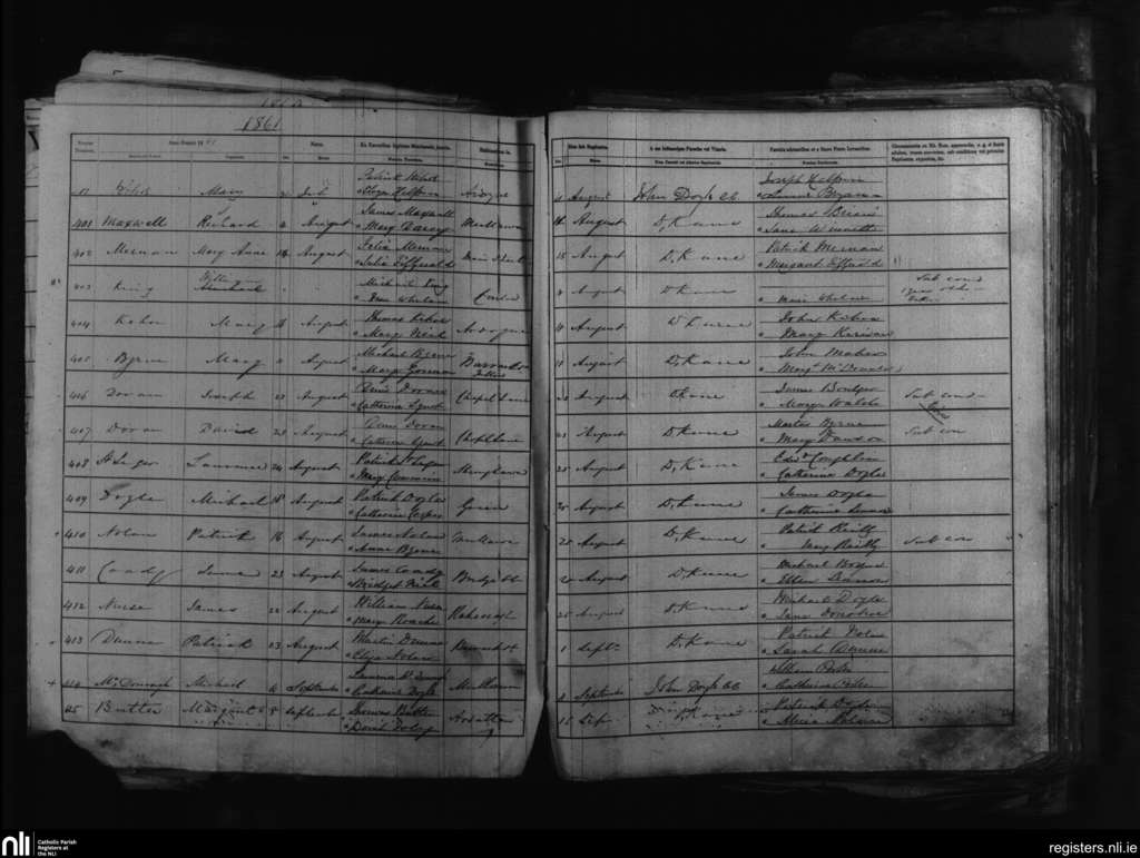 Tullow; County of Carlow; Diocese of Kildare and Leighlin. Baptisms, Aug. 1861 to Sep. 1861