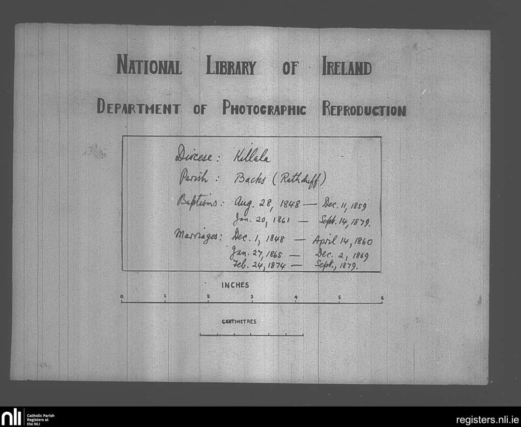 Backs; County of Mayo; Diocese of Killala. Baptisms, Marriages