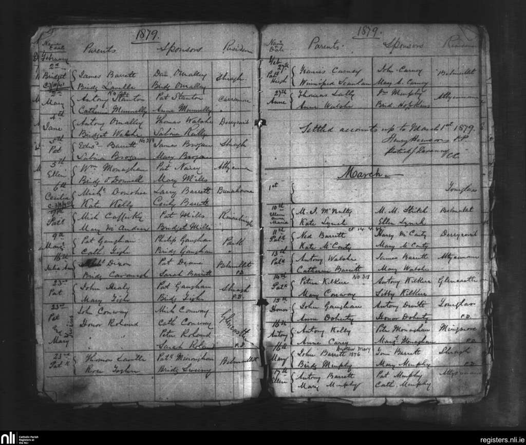 Belmullet; County of Mayo; Diocese of Killala. Baptisms, Feb. 1879 to Mar. 1879