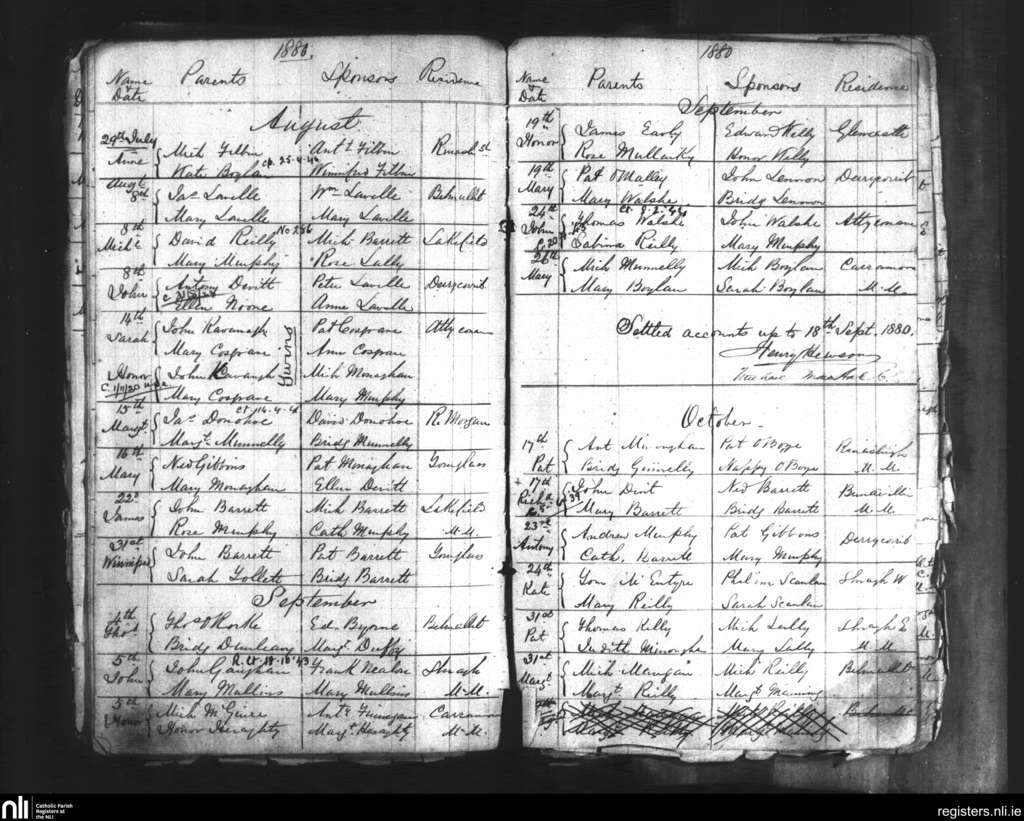 Belmullet; County of Mayo; Diocese of Killala. Baptisms, Aug. 1880 to Oct. 1880