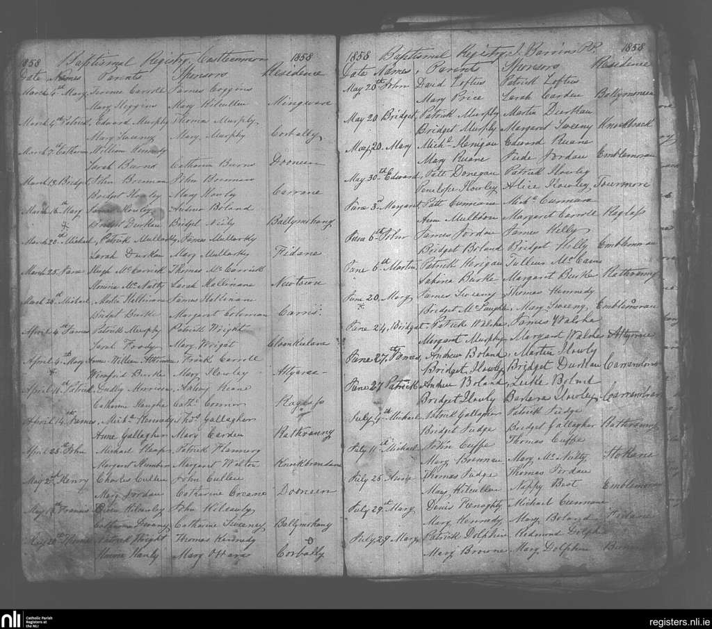 Castleconnor; County of Sligo; Diocese of Killala. Baptisms, Mar. 1858 to July 1858