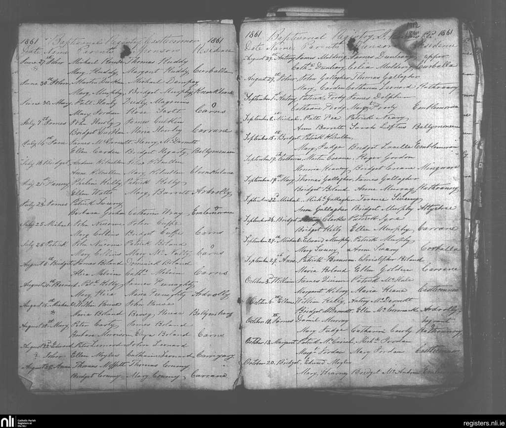 Castleconnor; County of Sligo; Diocese of Killala. Baptisms, June 1861 to Oct. 1861