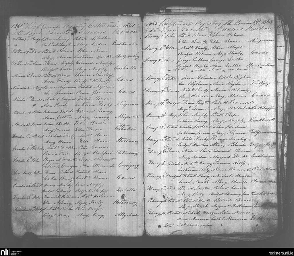 Castleconnor; County of Sligo; Diocese of Killala. Baptisms, Oct. 1861 to Feb. 1862