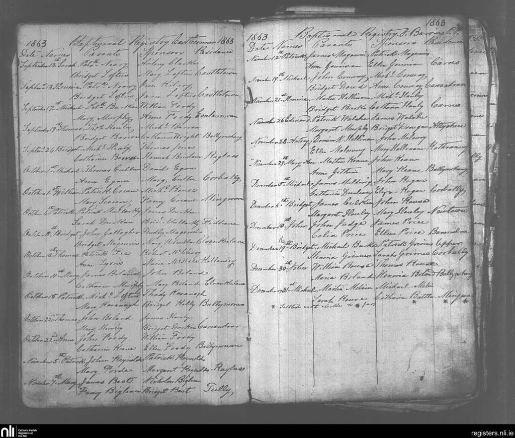 Castleconnor; County of Sligo; Diocese of Killala. Baptisms, Sep. 1863 to Dec. 1863
