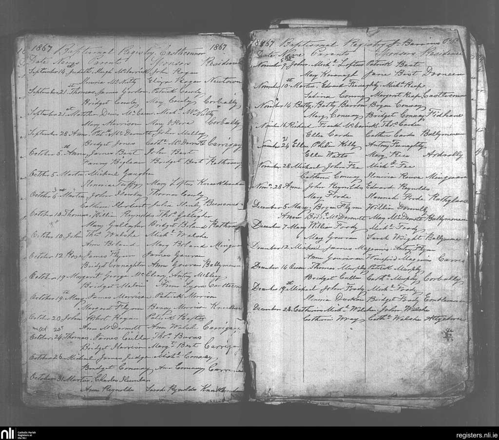 Castleconnor; County of Sligo; Diocese of Killala. Baptisms, Sep. 1867 to Dec. 1867
