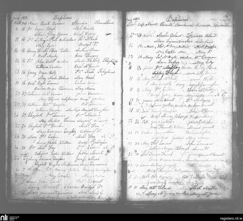 Crossmolina; County of Mayo; Diocese of Killala. Baptisms, June 1833 to Aug. 1833