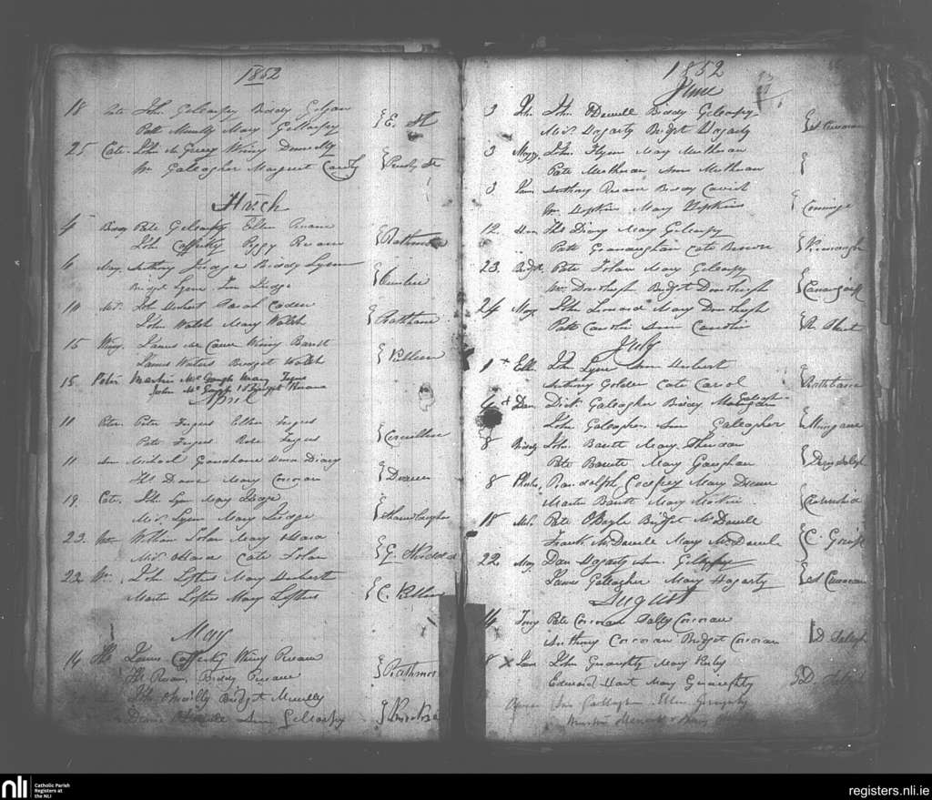 Crossmolina; County of Mayo; Diocese of Killala. Baptisms, Feb. 1852 to Aug. 1852