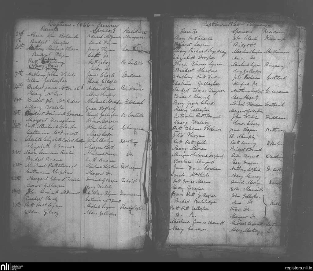 Crossmolina; County of Mayo; Diocese of Killala. Baptisms, Jan. 1866 to Feb. 1866