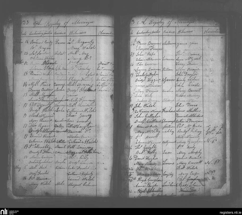 Crossmolina; County of Mayo; Diocese of Killala. Marriages, Jan. 1833 to Jan. 1834