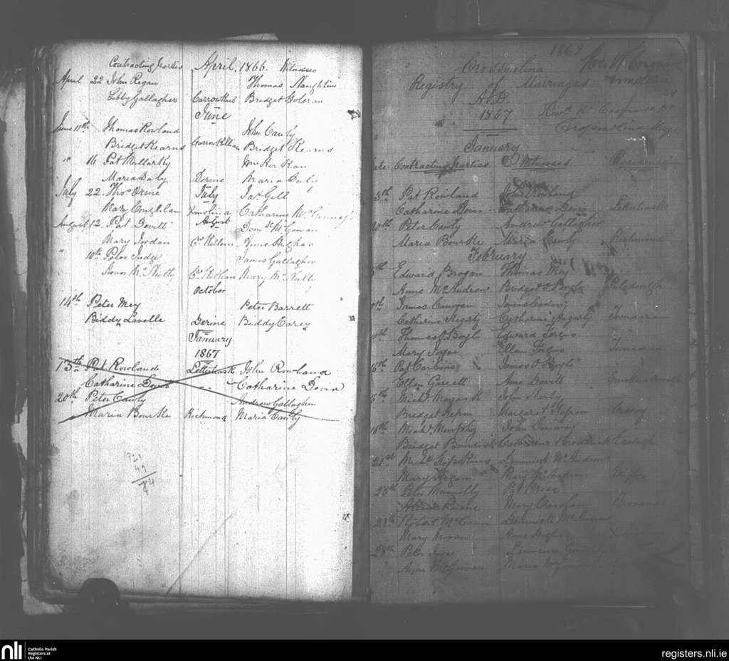 Crossmolina; County of Mayo; Diocese of Killala. Marriages, Apr. 1866 to Feb. 1867