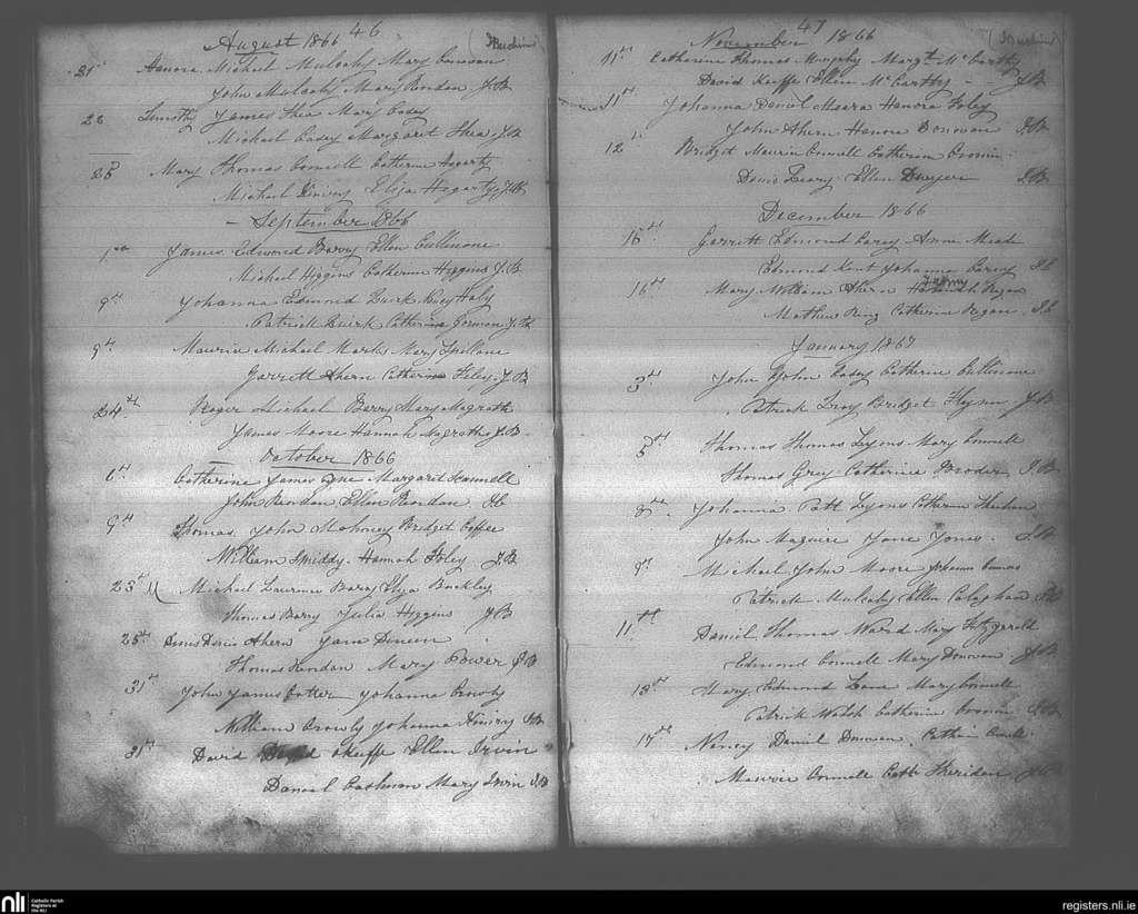 Lisgoold; County of Cork; Diocese of Cloyne. Baptisms, Marriages, Aug. 1866 to Jan. 1867
