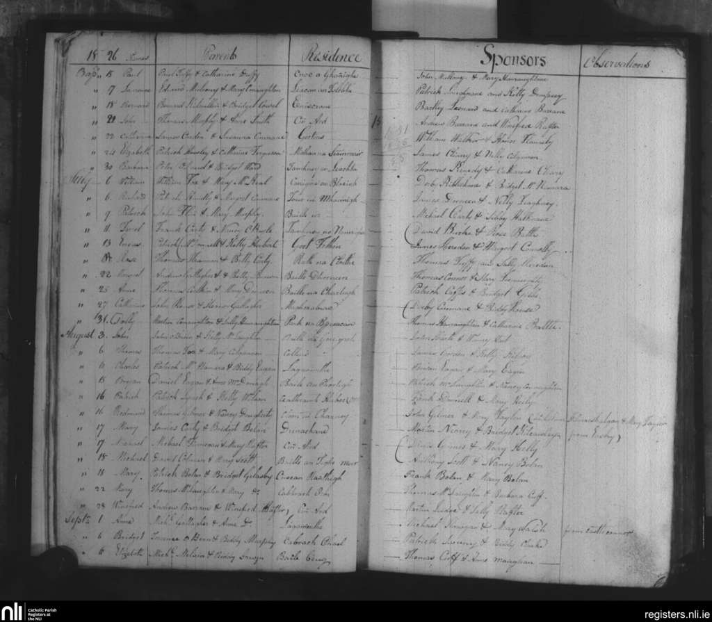 Kilglass; County of Sligo; Diocese of Killala. Baptisms, June 1826 to Sep. 1826