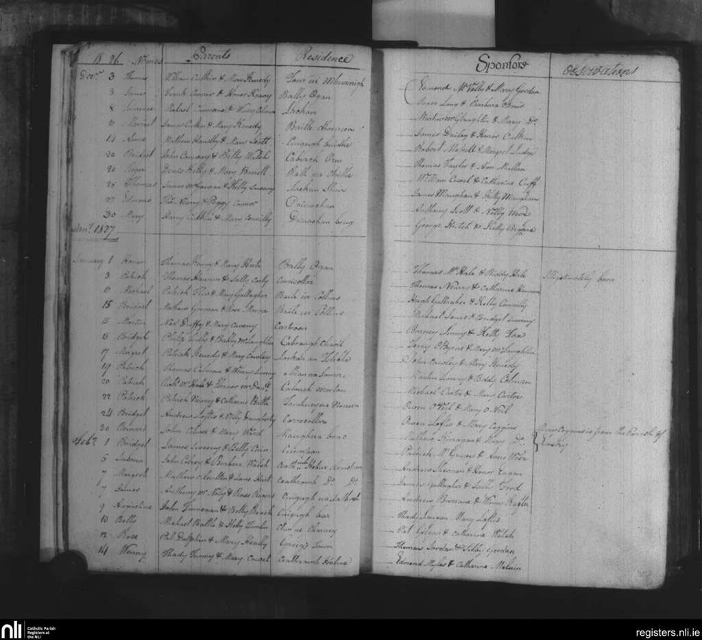 Kilglass; County of Sligo; Diocese of Killala. Baptisms, Dec. 1826 to Feb. 1827