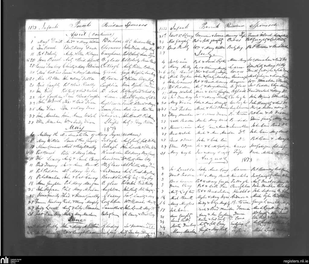 Kilmore Erris; County of Mayo; Diocese of Killala. Baptisms, Apr. 1873 to Aug. 1873