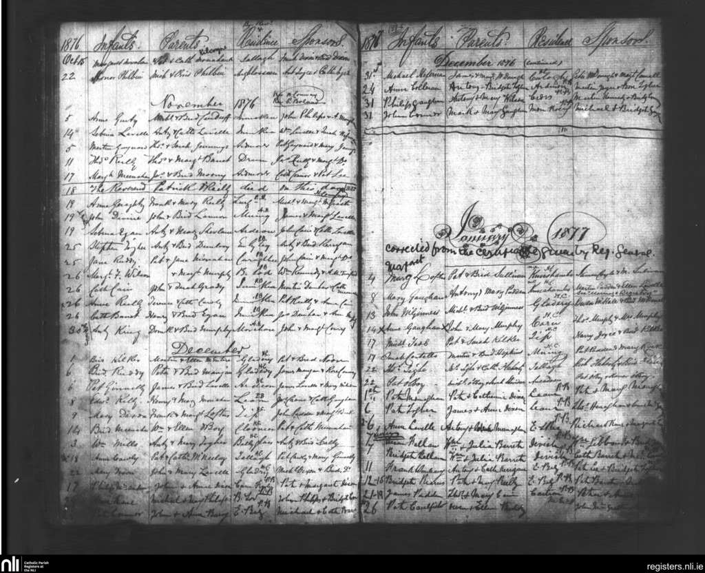 Kilmore Erris; County of Mayo; Diocese of Killala. Baptisms, Oct. 1876 to Jan. 1877