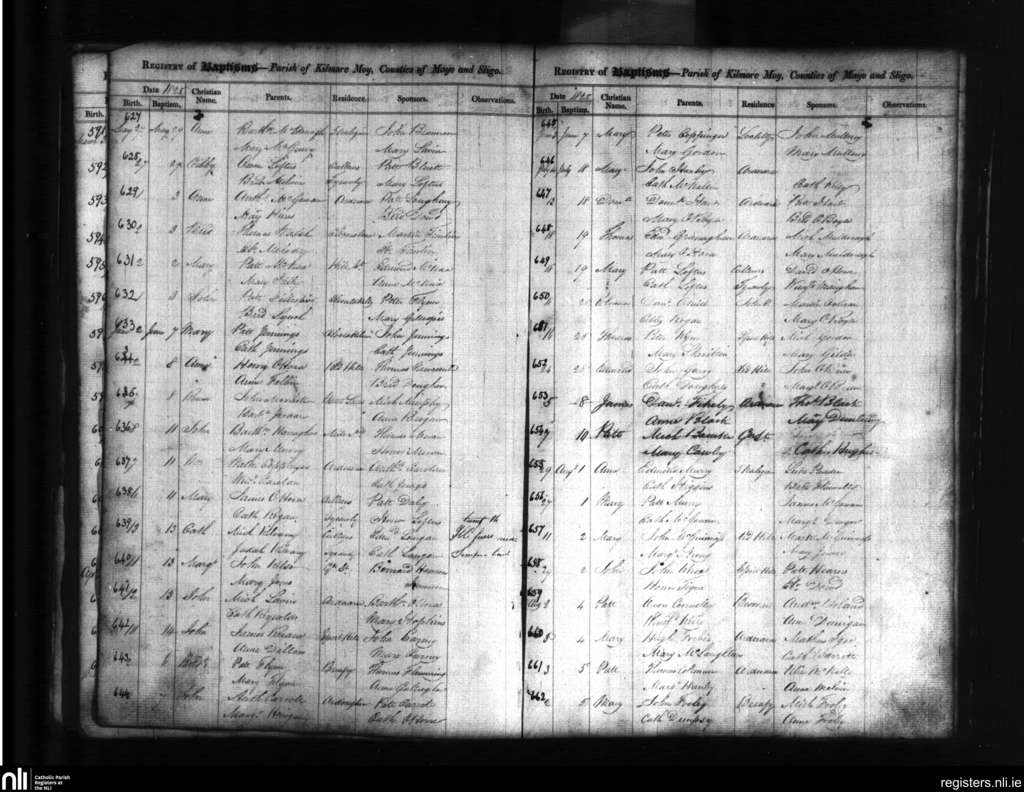 Kilmoremoy; County of Mayo, Sligo; Diocese of Killala. Baptisms, May 1825 to Aug. 1825