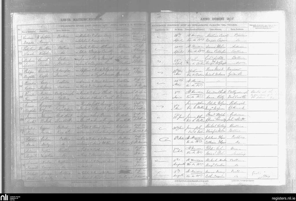 Kilmoremoy; County of Mayo, Sligo; Diocese of Killala. Marriages, Apr. 1873 to Aug. 1873