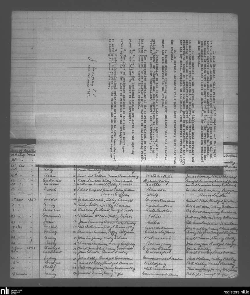 Lacken; County of Mayo; Diocese of Killala. Baptisms, Aug. 1852 to Mar. 1853