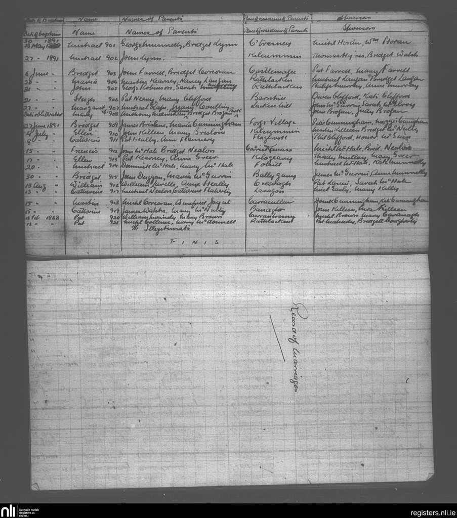 Lacken; County of Mayo; Diocese of Killala. Baptisms, Feb. 1868 to Aug. 1891