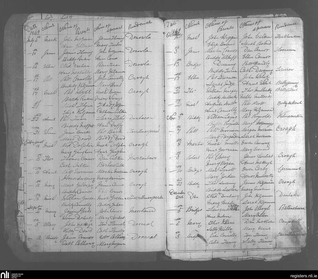 Templeboy; County of Sligo; Diocese of Killala. Baptisms, July 1869 to Dec. 1869