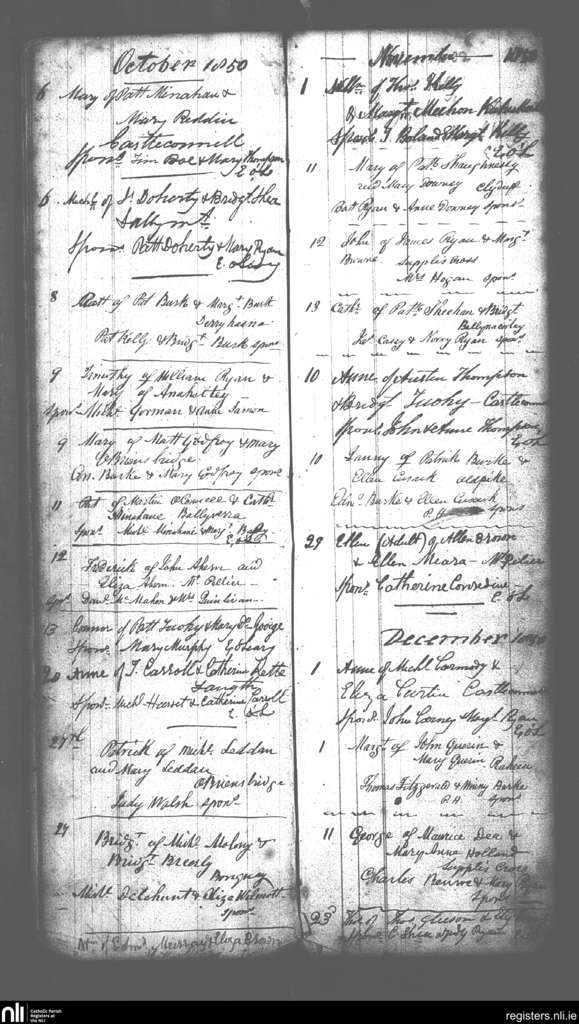 Castleconnell; County of Limerick, Tipperary; Diocese of Killaloe. Baptisms, Oct. 1850 to Dec. 1850