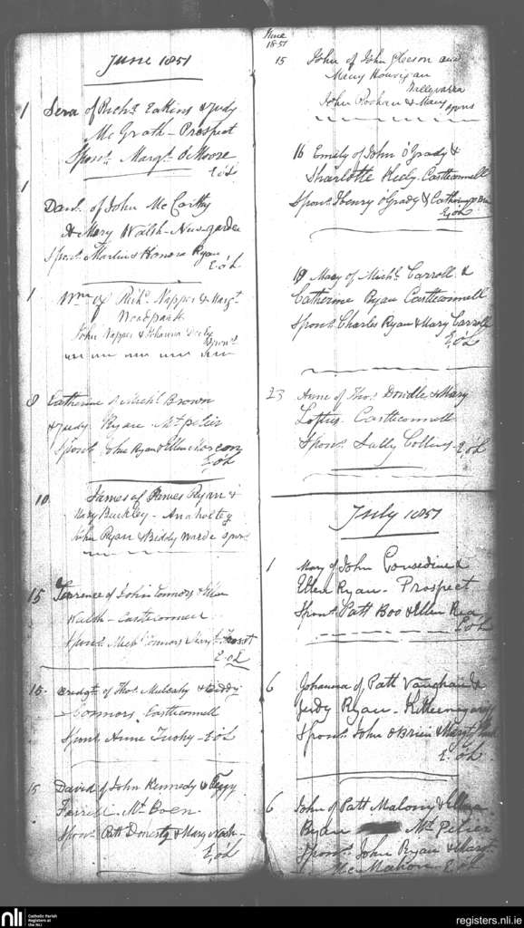 Castleconnell; County of Limerick, Tipperary; Diocese of Killaloe. Baptisms, June 1851 to July 1851