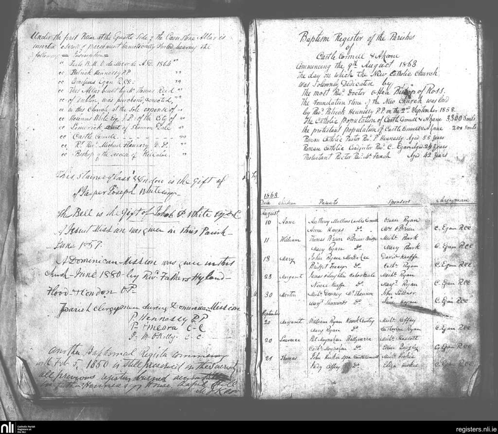 Castleconnell; County of Limerick, Tipperary; Diocese of Killaloe. Baptisms, Aug. 1863 to Sep. 1863