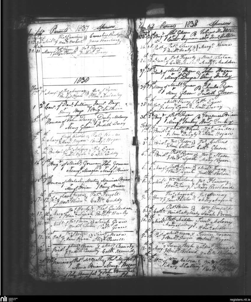 Youghal Arra; County of Tipperary; Diocese of Killaloe. Baptisms, Dec. 1837 to Feb. 1838