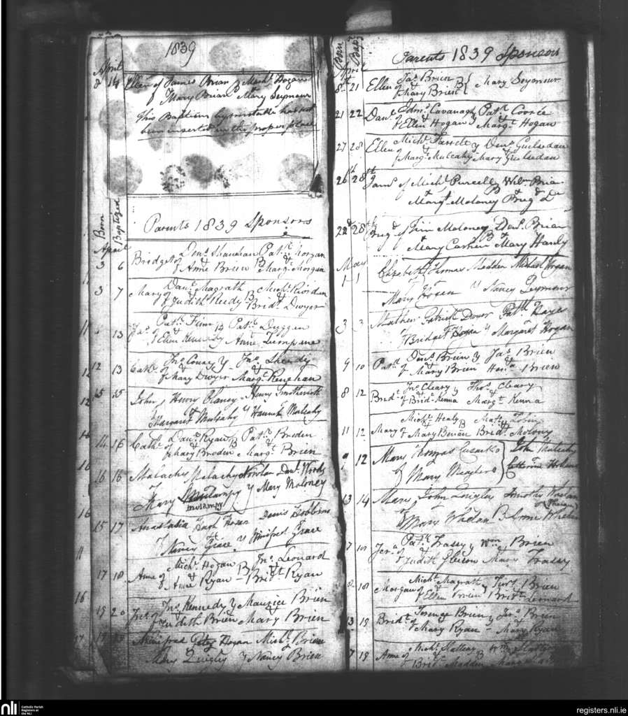 Youghal Arra; County of Tipperary; Diocese of Killaloe. Baptisms, Apr. 1839 to May 1839