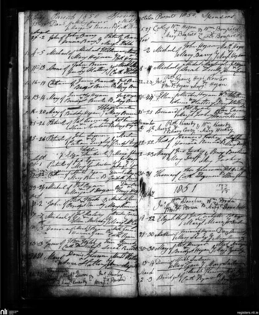 Youghal Arra; County of Tipperary; Diocese of Killaloe. Baptisms, July 1850 to Mar. 1851