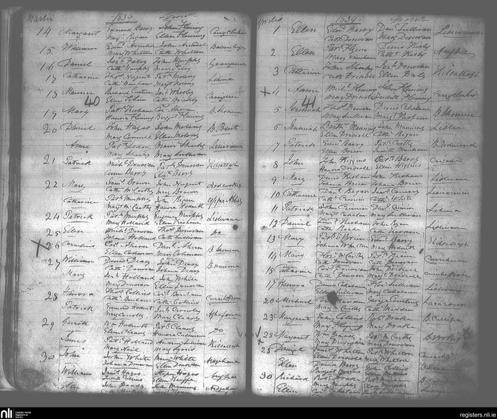 Lislee; County of Cork; Diocese of Cork and Ross. Baptisms, Mar. 1839 to Apr. 1839