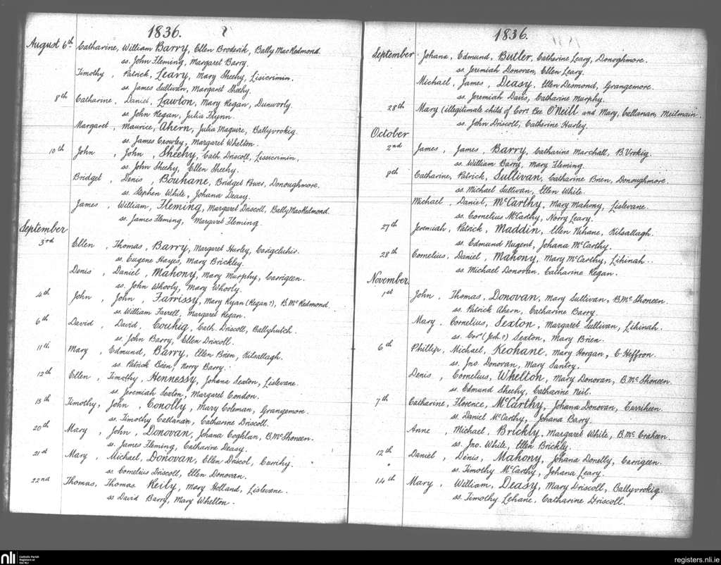 Lislee; County of Cork; Diocese of Cork and Ross. Baptisms, Aug. 1836 to Nov. 1836
