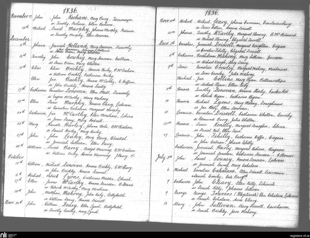 Lislee; County of Cork; Diocese of Cork and Ross. Baptisms, July 1836 to Dec. 1836
