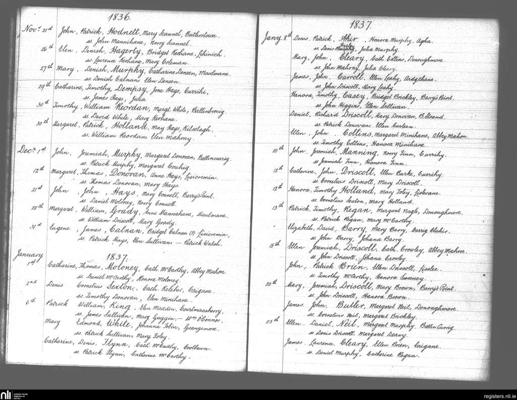 Lislee; County of Cork; Diocese of Cork and Ross. Baptisms, Nov. 1836 to Jan. 1837