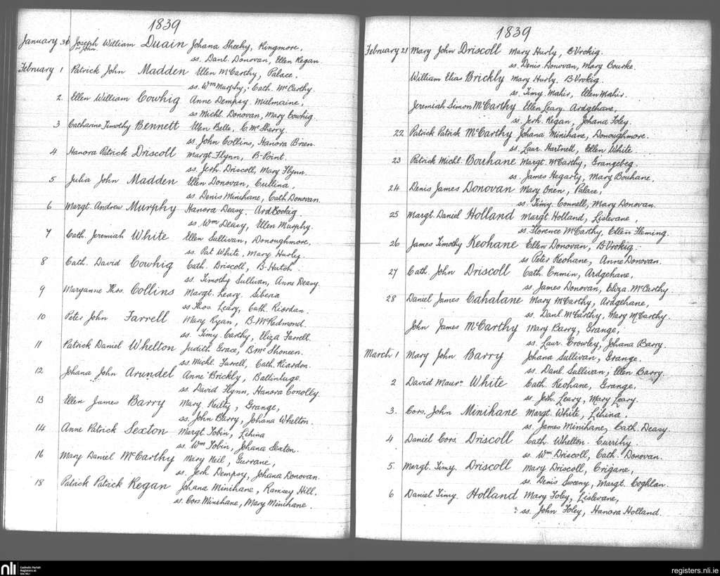 Lislee; County of Cork; Diocese of Cork and Ross. Baptisms, Jan. 1839 to Mar. 1839