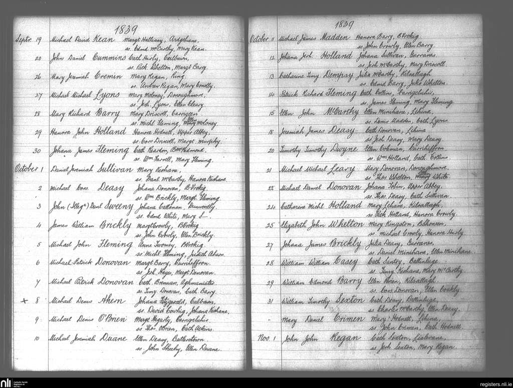 Lislee; County of Cork; Diocese of Cork and Ross. Baptisms, Sep. 1839 to Nov. 1839