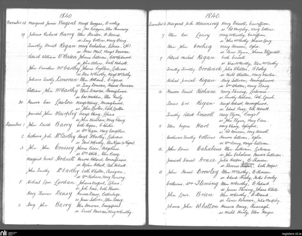 Lislee; County of Cork; Diocese of Cork and Ross. Baptisms, Nov. 1840 to Dec. 1840