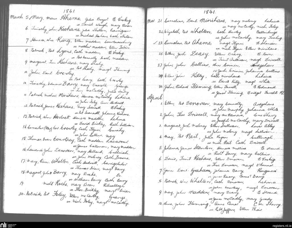 Lislee; County of Cork; Diocese of Cork and Ross. Baptisms, Mar. 1841 to Apr. 1841