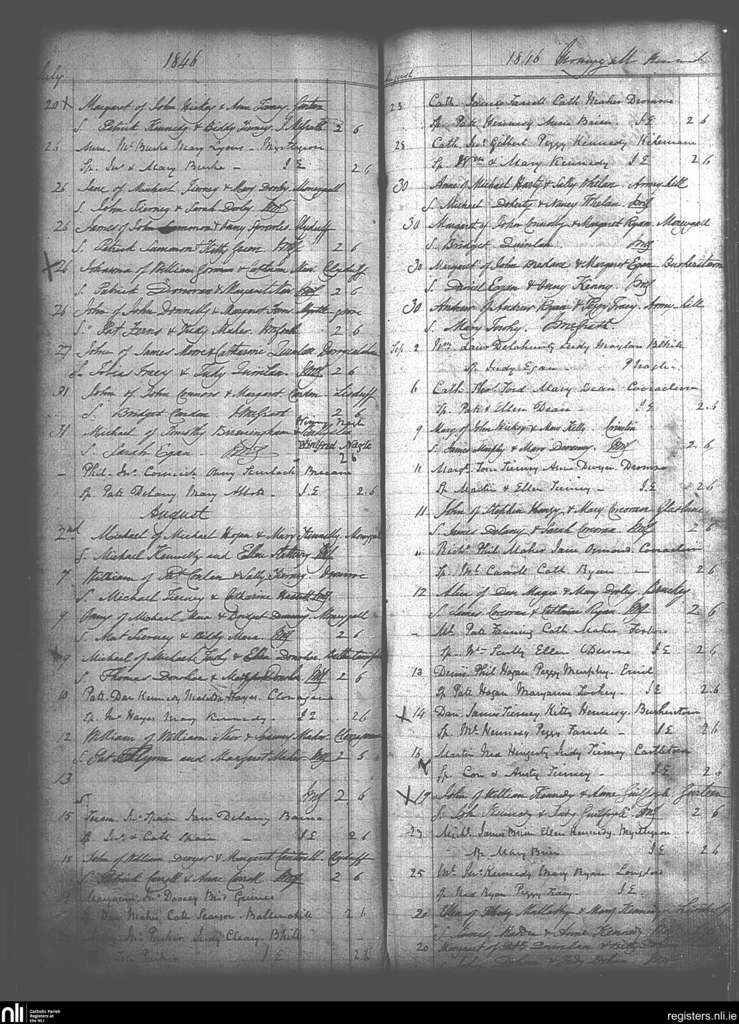 Moneygall; County of Offaly, Tipperary; Diocese of Killaloe. Baptisms, July 1846 to Sep. 1846
