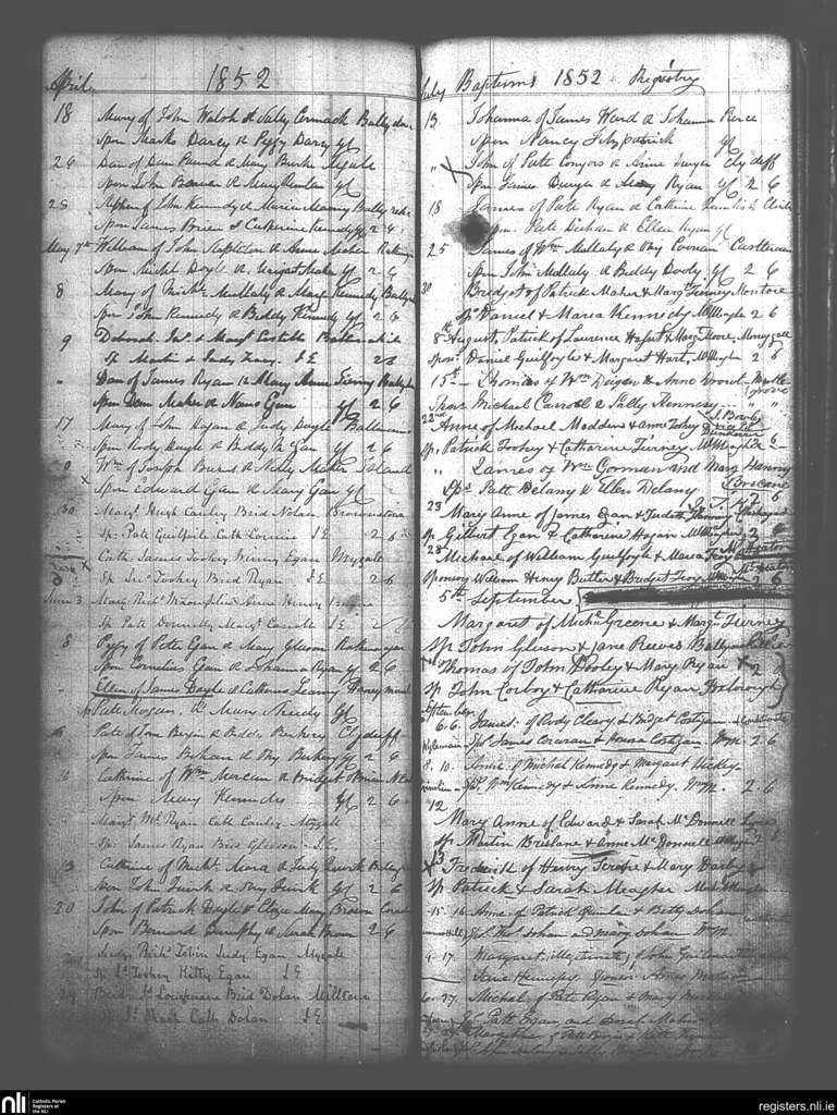 Moneygall; County of Offaly, Tipperary; Diocese of Killaloe. Baptisms, Apr. 1852 to Sep. 1852