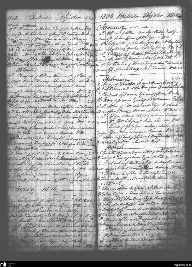 Moneygall; County of Offaly, Tipperary; Diocese of Killaloe. Baptisms, Oct. 1853 to Mar. 1854