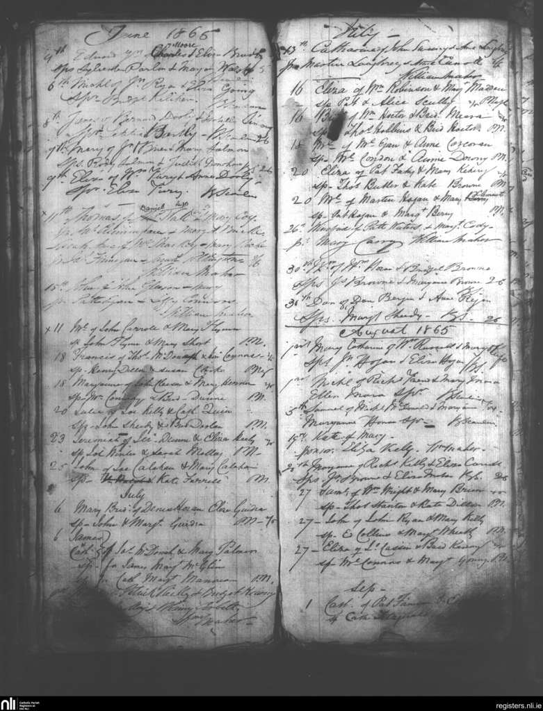 Birr and Loughkeen; County of Offaly, Tipperary; Diocese of Killaloe. Baptisms, June 1865 to Sep. 1865