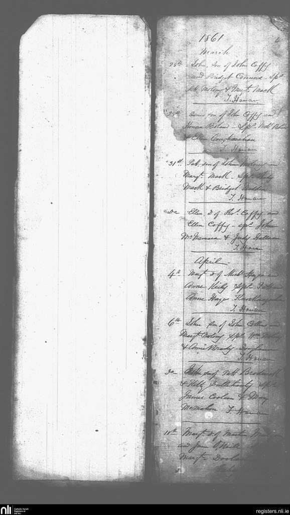 Caher Feakle; County of Clare; Diocese of Killaloe. Baptisms, Mar. 1861 to Apr. 1861