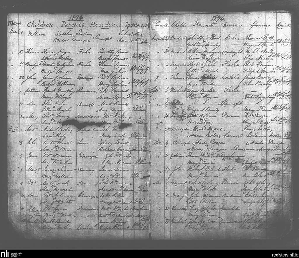 Caher Feakle; County of Clare; Diocese of Killaloe. Baptisms, Mar. 1874 to Nov. 1874