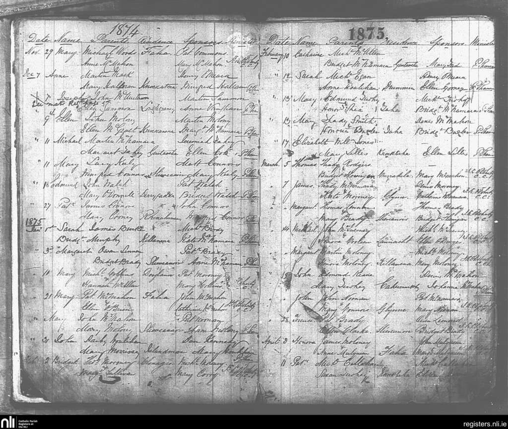 Caher Feakle; County of Clare; Diocese of Killaloe. Baptisms, Nov. 1874 to Apr. 1875